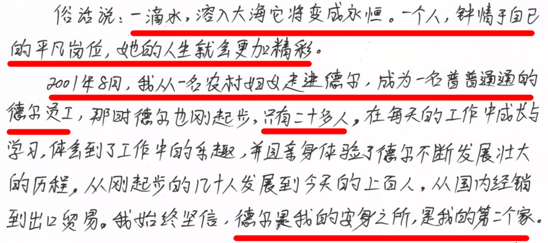此刻我想起了第一次德爾的情形,那是2006年。當(dāng)時,我們普通員工的工作服是類似于醫(yī)生的白大褂,有些零件還需要訂購,工廠也不是很大,沒有場面的混亂,也沒有人員的抱怨,這給我留下非常深刻的印象,它讓我看到了這是一個團結(jié)一致、彼此依托、共同進步的集體。讓我對公司的敬意油然而生。但在這短短的十幾年里,工廠發(fā)生了翻天覆地的變化,我們的工作服變得更加的正式正規(guī),變得越來越專業(yè),公司的管理制度也越來越人性化,有了自己的廠房,零件也完全有能力自行生產(chǎn)。